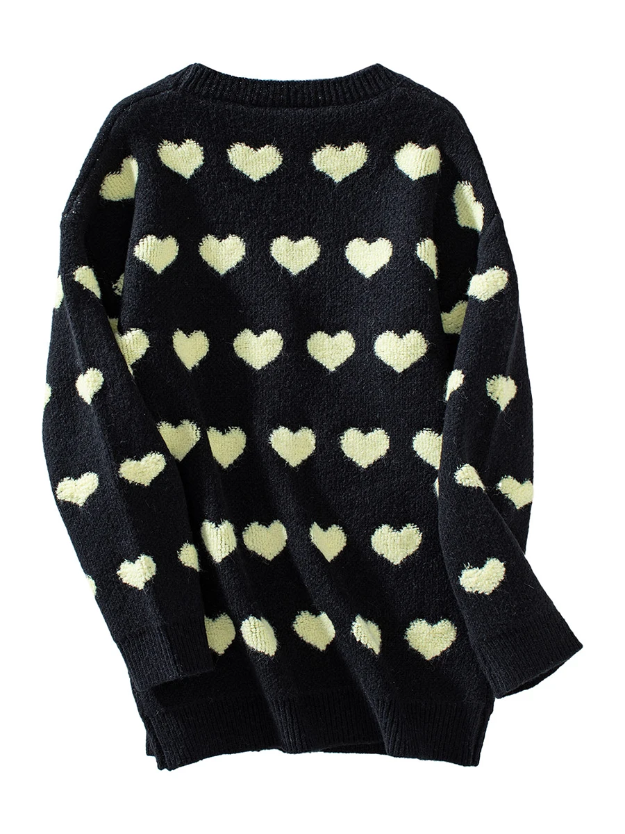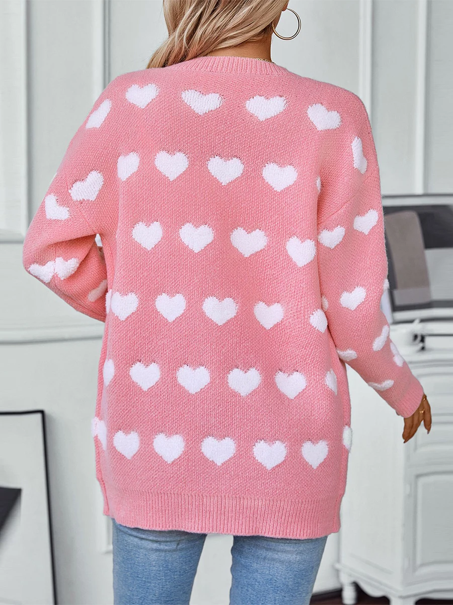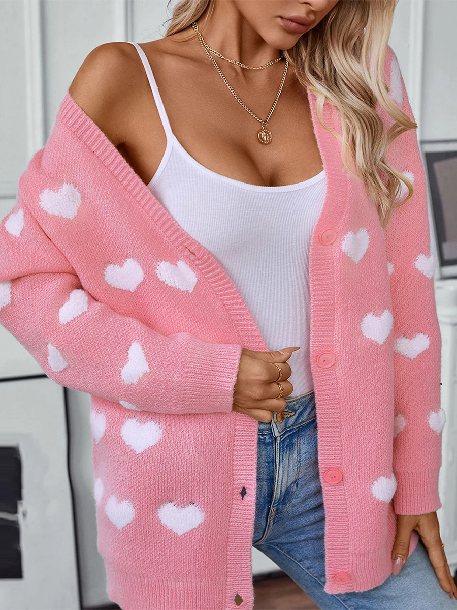 Upgrade your fall and winter wardrobe with this Cable Knit Button-Down Cardigan. Made from 100% polyester, this cozy sweater features a V-neck shawl collar, full-length sleeves, and practical pockets. Its loose-fitting, heart-patterned design adds a playful yet classic touch to any outfit. Perfect for layering over casual or workwear, this versatile cardigan is available in pink, burgundy, and black, and comes in sizes S to XL.