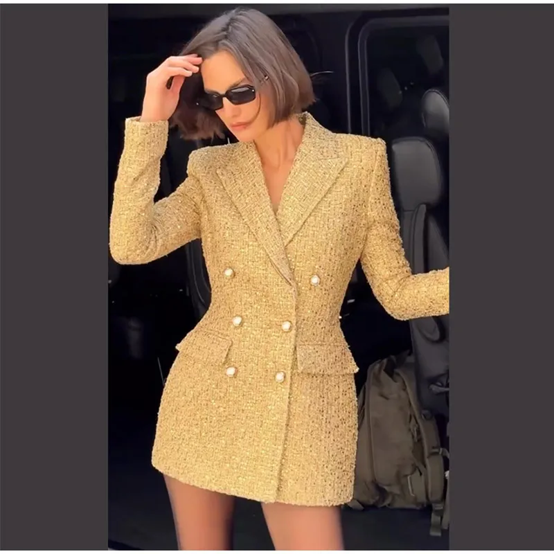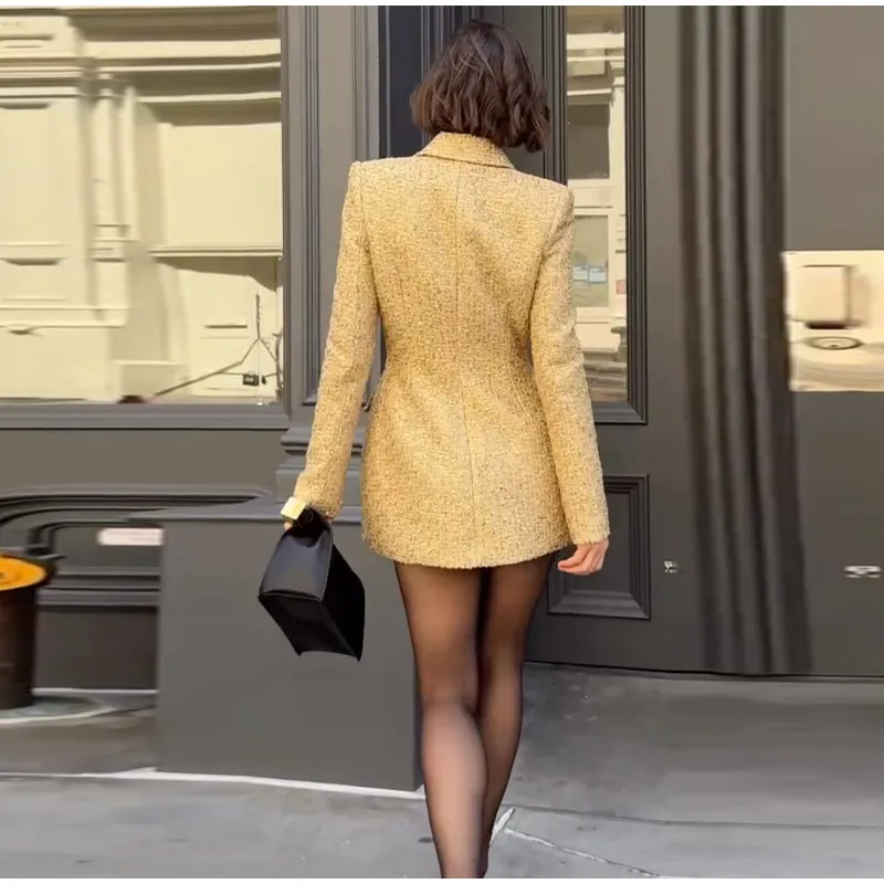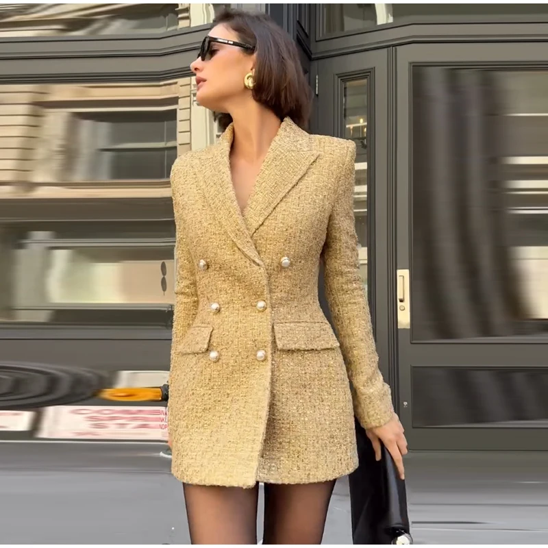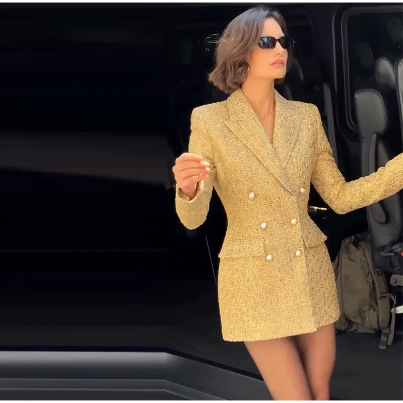 Perfect for evening events, elegant gatherings, or stylish workwear, it combines classic tailoring with a touch of modern glamour. The fitted cut enhances your natural shape, while the soft stretch fabric ensures comfort and ease throughout the day or night.