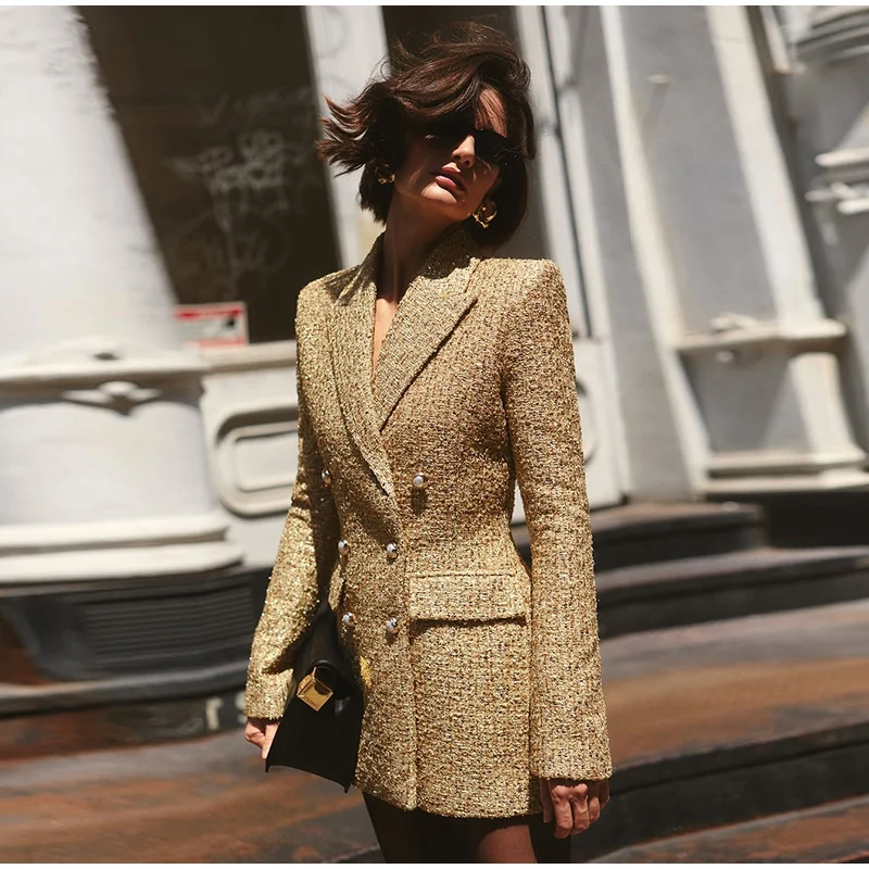 This tailored blazer features structured shoulder pads, a sleek double-breasted silhouette, and subtle sequin shimmer that elevates any outfit from simple to standout.
