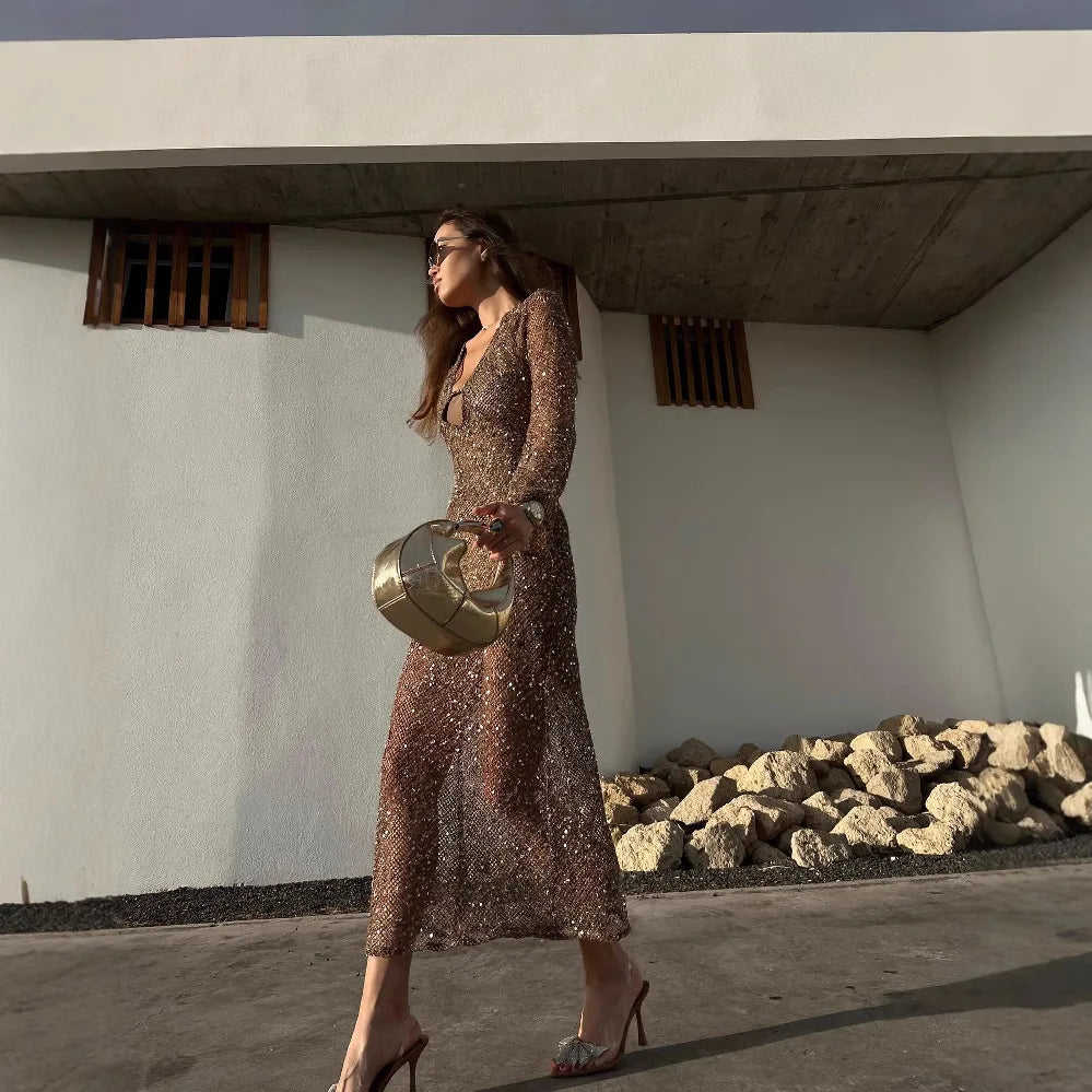 The Obsidia Eclipse Party Dress is a striking blend of sensual elegance and modern refinement. Designed with shimmering sequin detailing and subtle sheer accents, this dress creates a captivating silhouette made for unforgettable evenings.