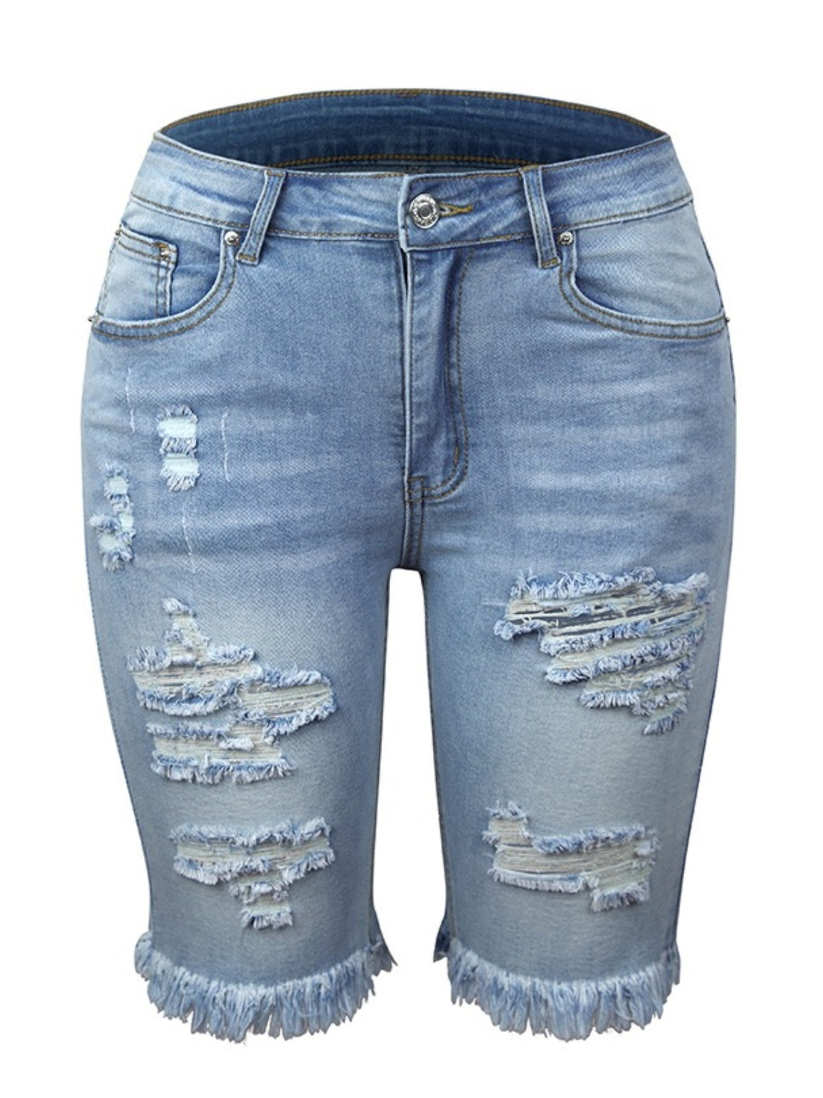 Upgrade your casual style with these Ripped Denim Quarter-Length Shorts, designed with trendy frayed hems for a laid-back yet edgy look. Crafted from soft, durable denim, they offer a comfortable fit and timeless appeal. Perfect for pairing with crop tops, tees, or oversized shirts, these shorts bring effortless street-style vibes to your summer wardrobe.