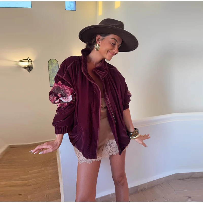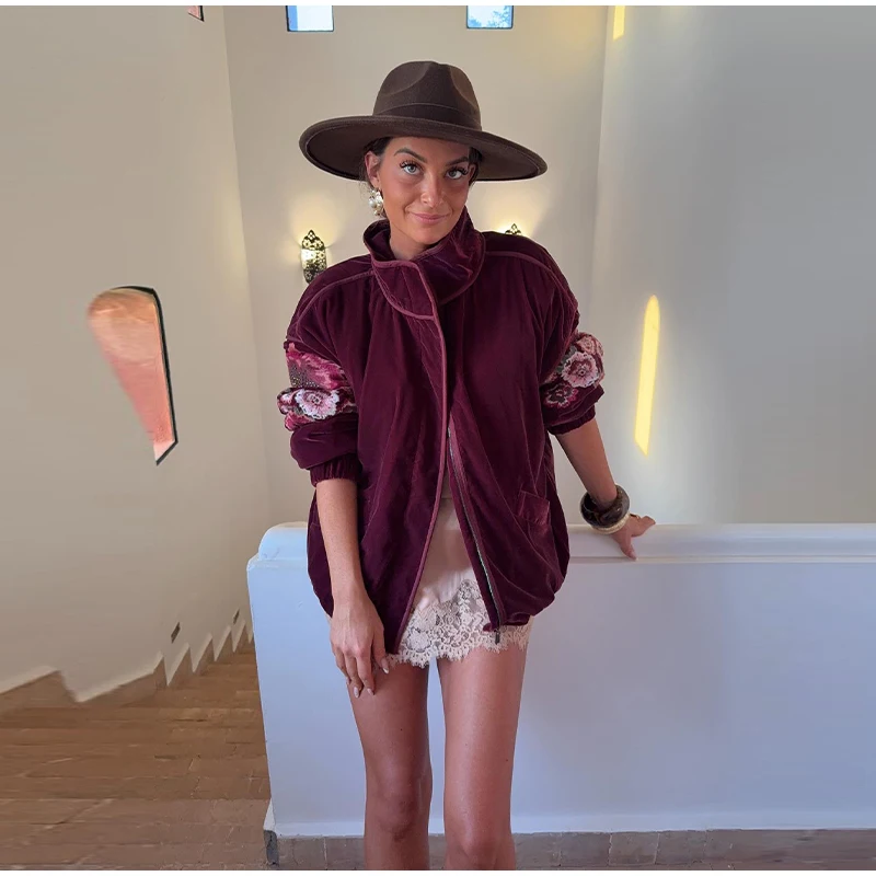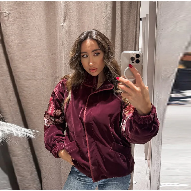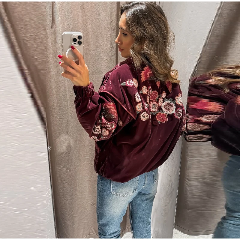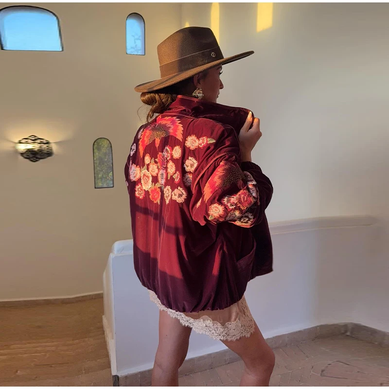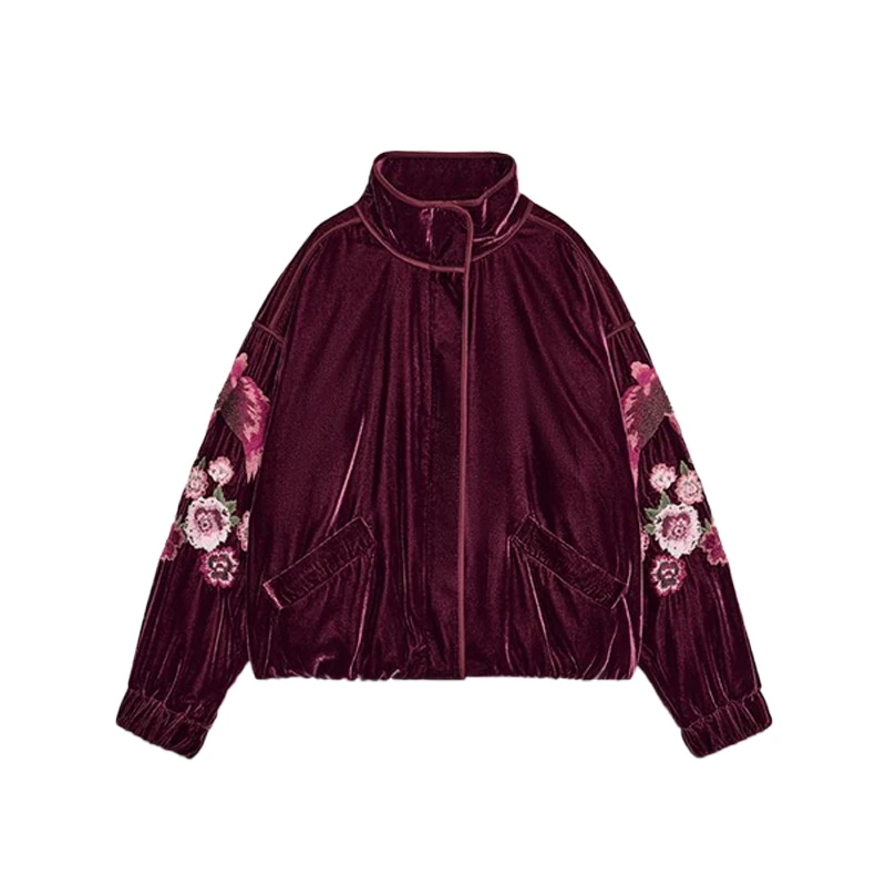 Crafted from plush velvet fabric with intricate floral embroidery, this jacket adds effortless sophistication to any outfit — whether for city strolls, evening dinners, or festive gatherings.