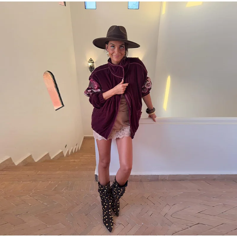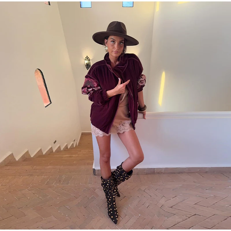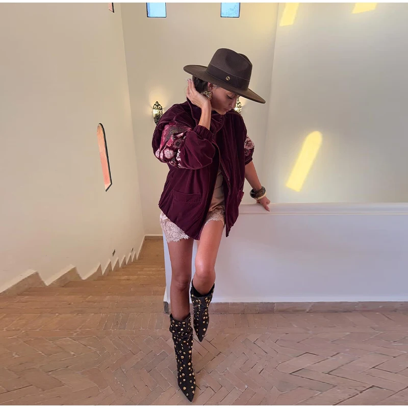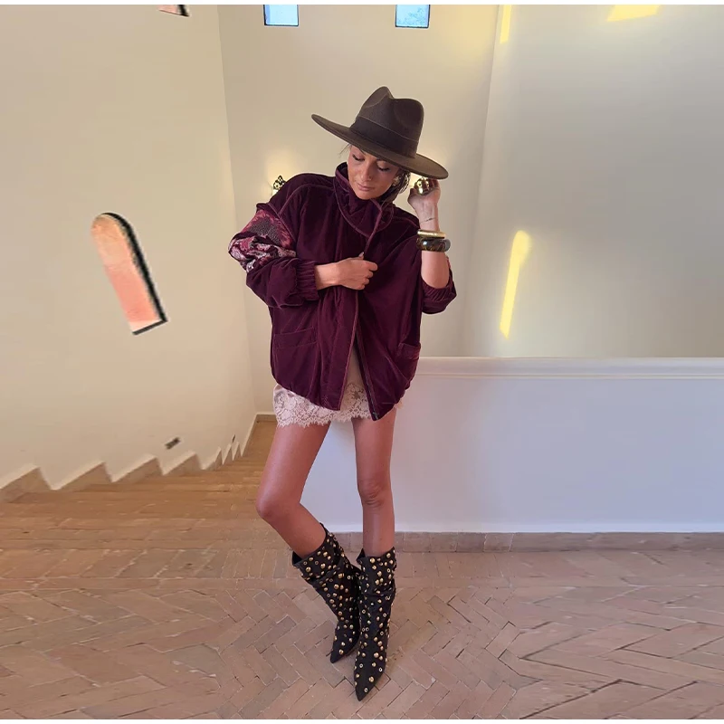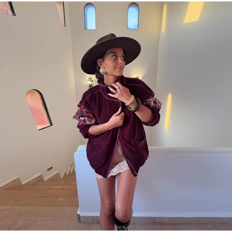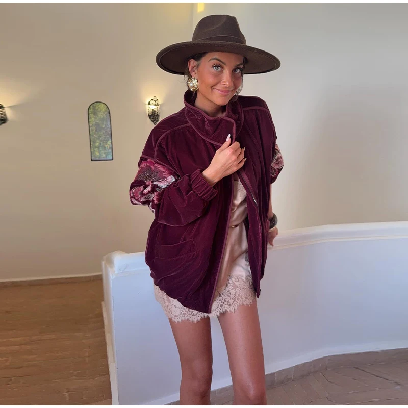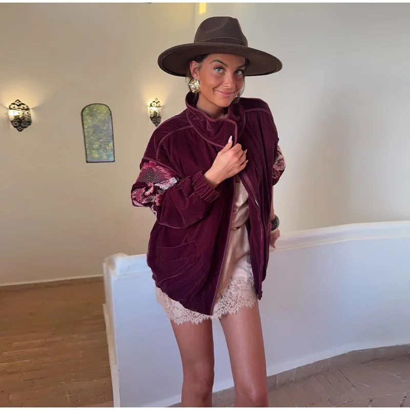 Crafted from plush velvet fabric with intricate floral embroidery, this jacket adds effortless sophistication to any outfit — whether for city strolls, evening dinners, or festive gatherings.