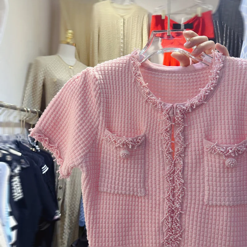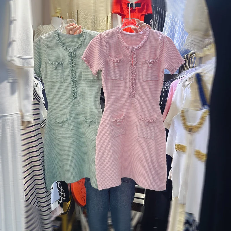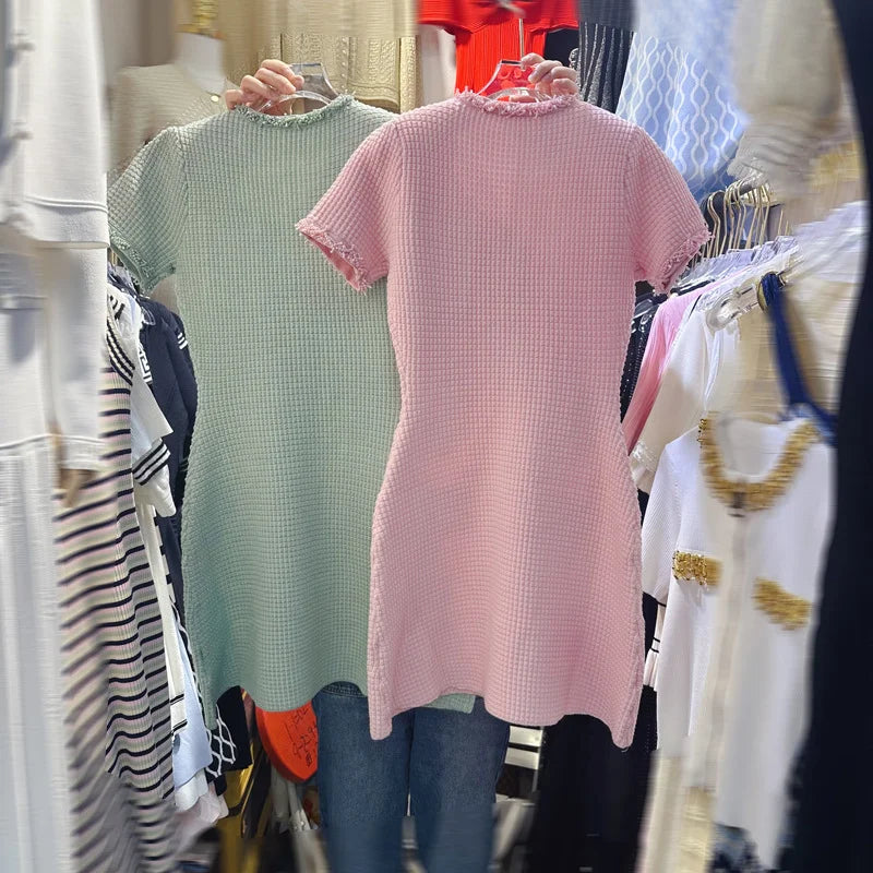 Its straight silhouette, short sleeves, and comfortable stretch make it suitable for warm weather while offering a flattering fit. Whether styled for gatherings, evening occasions, or refined day wear, this knitted mini dress delivers a polished, effortless look.
