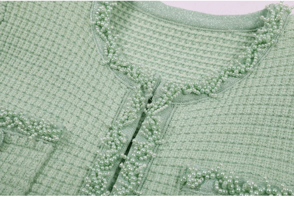 The Opal Pearl Knit Mini Dress blends elegance with a refined modern touch. Crafted from a soft and breathable polyester–spandex knit, this dress features pearl crystal embellishments and a smooth single-breasted design that adds subtle sophistication.
